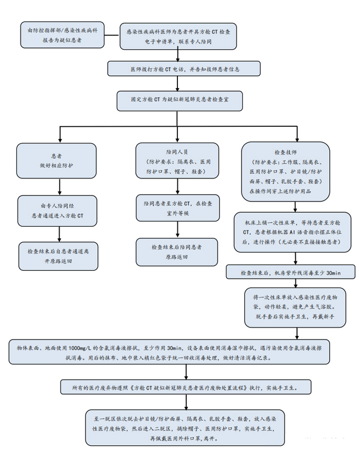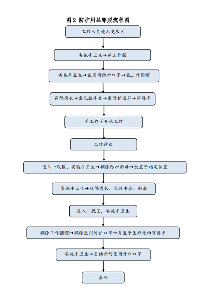除X線電離防護外,方艙CT檢查需對操作技師、患者及家屬做相應(yīng)的防護。根據(jù)國家衛(wèi)生健康委辦公廳印發(fā)的《新型冠狀病毒肺炎防控方案》(第五版)[6]對于在新型冠狀病毒感染的肺炎疫情防控工作中不同的工作人員其防護等級是不同的。如是疑似患者,技師則執(zhí)行二級防護。方艙CT內(nèi),設(shè)置清潔區(qū)、一脫區(qū)、二脫區(qū)、免洗手消毒液、一次性防護服、一次性乳膠手套、鞋套、洗手液。技師需經(jīng)多次反復(fù)訓(xùn)練穿脫流程和檢查流程,并做好總結(jié),考察合格方可上崗。為此我科花費了大量時間進行了防護用品穿脫,消殺,接診流程的演練,并做總結(jié)和改進措施。(附件1所示),防護用品穿脫流程如圖2所示。