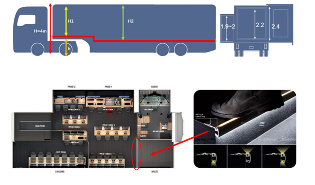 由于國(guó)家限定了轉(zhuǎn)播車在行駛中的尺寸,尤其是高度和寬度,無論選用什么車型,寬度都限定在2.55米以內(nèi),因此只有通過增加拉箱來擴(kuò)展使用空間。