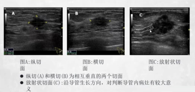 乳腺DR檢查乳腺的縱切和橫切為相互垂直的兩個切面,放射狀切面,也就是以乳頭為中心來進(jìn)行一個掃查,為什么要強調(diào)放射狀切面呢?可以看到病灶是沿著導(dǎo)管方向的。沿導(dǎo)管生長方向,對判斷導(dǎo)管內(nèi)病灶有較大的臨床意義。檢查留圖要有橫縱切面,放射狀切面。乳腺病灶的定位有兩種方法,一種是以乳頭為中心,經(jīng)過乳頭水平線與垂直線,將乳房分為4個象限,外上下象限,內(nèi)上下象限。另外一種是時鐘定位法,以乳頭為中心,采用12小時鐘點制,病變距乳頭的距離。