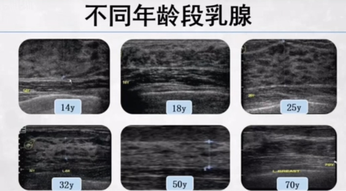 正常乳腺超聲聲像圖,乳腺超聲設備高分辨力超聲能夠清晰顯示乳腺及其周圍組織的解剖結構??梢钥吹饺橄傧袤w,高回聲的皮膚層,低回聲的皮下脂肪層,然后是乳腺的腺體結構,那么后方的是乳腺腺體后脂肪,胸大肌,胸膜,乳腺的支撐機構韌帶。乳腺掃查的時候乳頭乳暈區(qū)的掃查。乳頭的病變率還是有的。使用多量耦合劑觀察,對乳頭非常細致的掃查。觀察乳腺乳頭的情況跟改變。乳頭邊界清楚的外凸圓形結節(jié),均勻的中等回聲,后方都伴有聲影。乳腺導管與小葉,類似一小串葡萄。