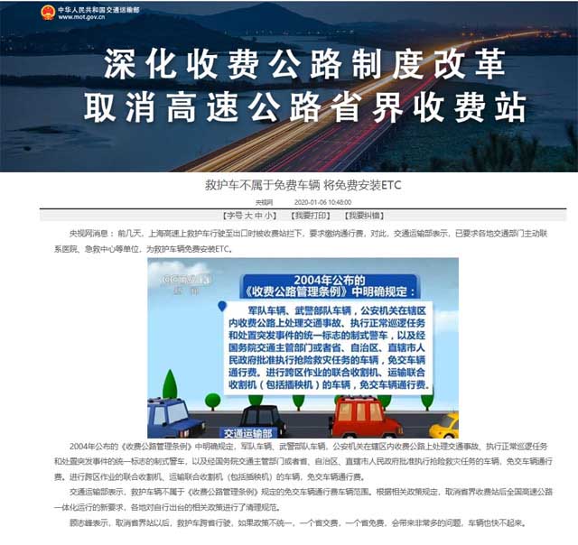 報道稱: 央視網(wǎng)消息 :前幾天,上海高速上救護車行駛至出口時被收費站攔下,要求繳納通行費,對此,交通運輸部表示,已要求各地交通部門主動聯(lián)系醫(yī)院、急救中心等單位,為救護車輛免費安裝ETC。 2004年公布的《收費公路管理條例》中明確規(guī)定,軍隊車輛、武警部隊車輛,公安機關(guān)在轄區(qū)內(nèi)收費公路上處理交通事故、執(zhí)行正常巡邏任務(wù)和處置突發(fā)事件的統(tǒng)一標志的制式警車,以及經(jīng)國務(wù)院交通主管部門或者省、自治區(qū)、直轄市人民政府批準執(zhí)行搶險救災任務(wù)的車輛,免交車輛通行費。進行跨區(qū)作業(yè)的聯(lián)合收割機、運輸聯(lián)合收割機(包括插秧機)的車輛,免交車輛通行費。 交通運輸部表示,救護車輛不屬于《收費公路管理條例》規(guī)定的免交車輛通行費車輛范圍。根據(jù)相關(guān)政策規(guī)定,取消省界收費站后全國高速公路一體化運行的新要求,各地對自行出臺的相關(guān)政策進行了清理規(guī)范。 顧志峰表示,取消省界站以后,救護車跨省行駛,如果政策不統(tǒng)一,一個省交費,一個省免費,會帶來非常多的問題,車輛也快不起來。